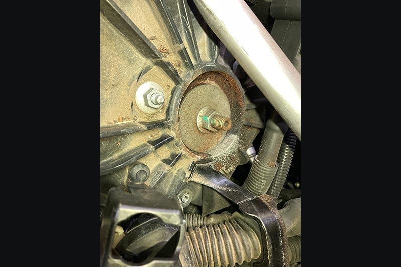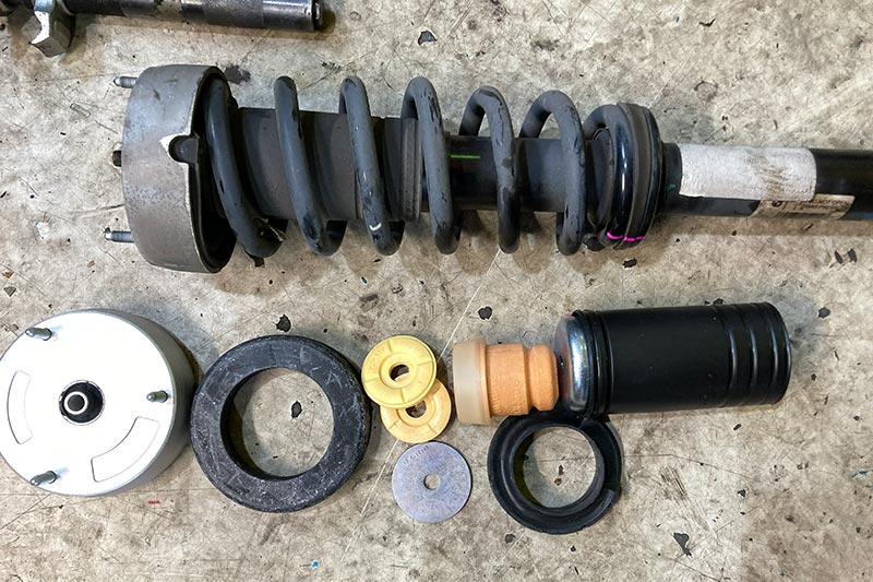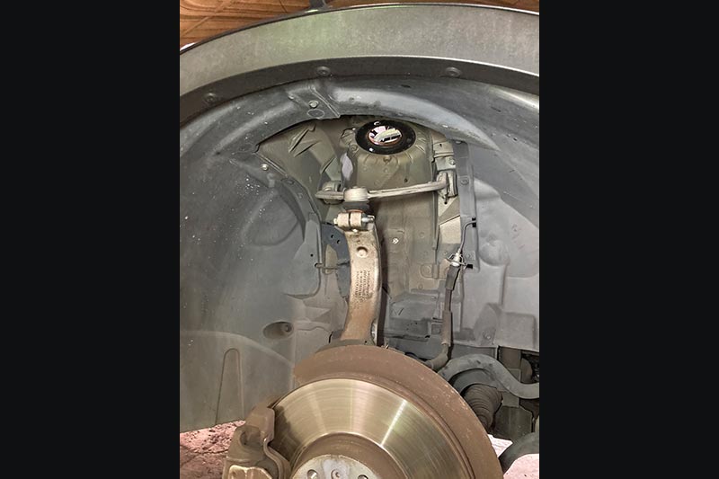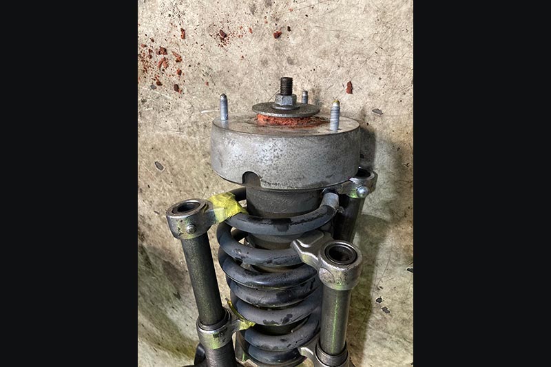明らかに上部から音が出ていたので、ボンネットを開け、ショックのアッパー部分を確認してみるとブッシュが劣化で抜けてしまい車両のフレームと擦れて音が出ていた様です。